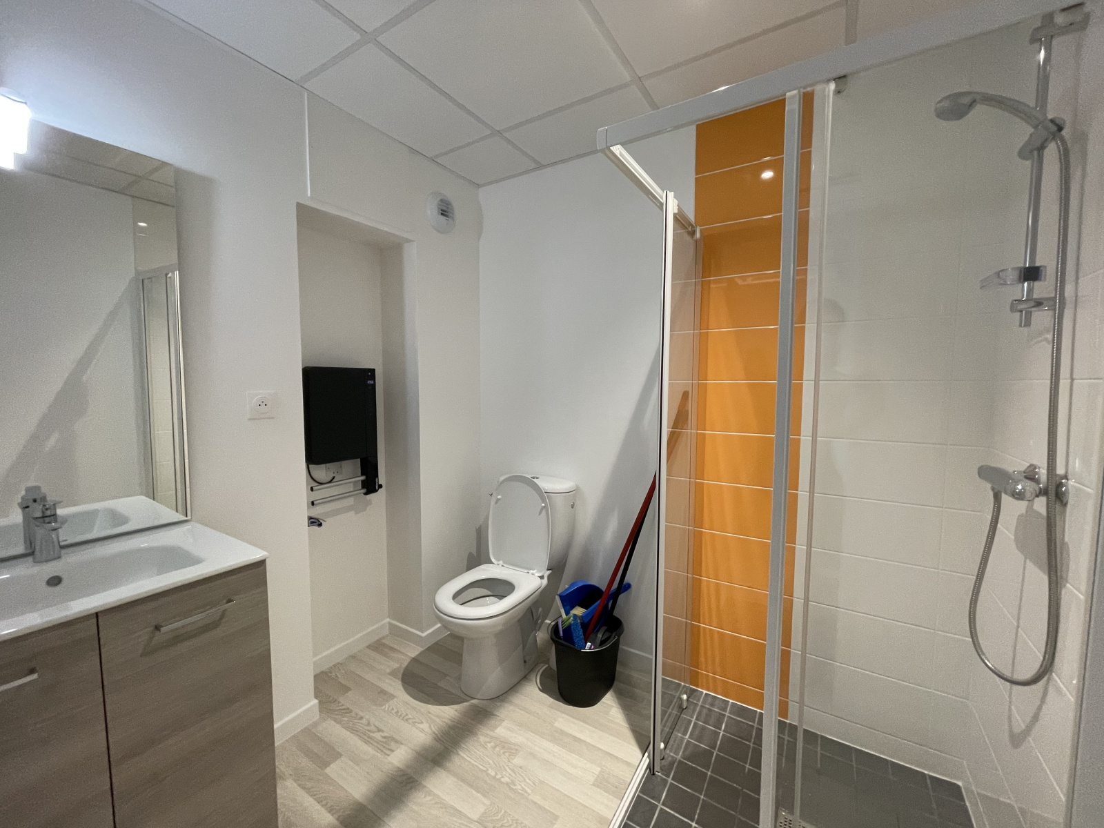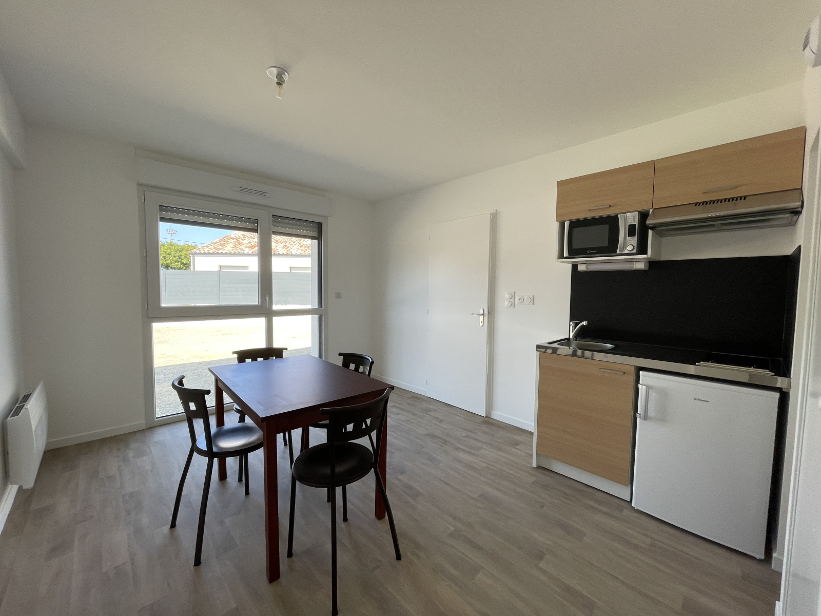 L’appartement comprend une pièce de vie avec un coin cuisine, une salle d’eau avec WC et une chambre avec placard.